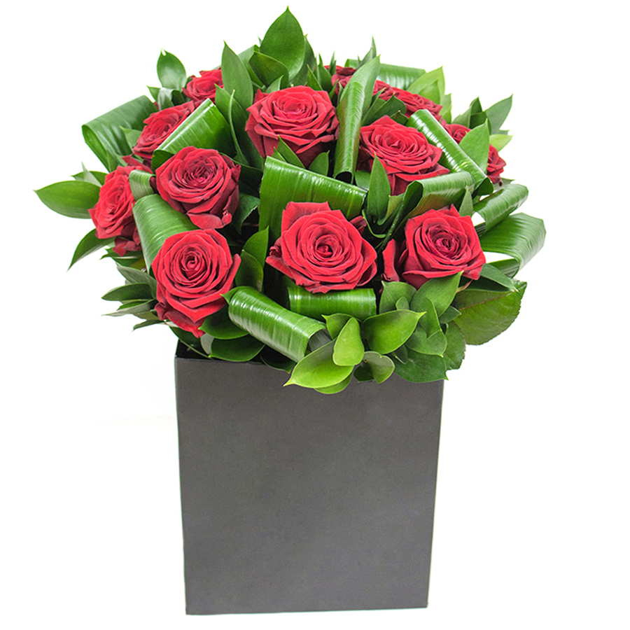 Illuminate your surroundings with the radiant beauty of our hand-selected red roses, complemented by aspidistra leaves and ruscus. This unique bouquet infuses elegance and style into any space, making it an ideal gift for loved ones or a graceful addition to your home.