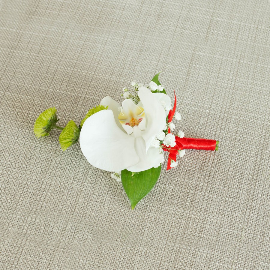 The groom buttonhole is the last, but not less important detail of the groom's look. With this so attractive bunch of white orchid, green mini chrysanthemums and gypsophila tight neatly with elegant red ribbon, every groom will make a good impression by showing good taste and elegance.