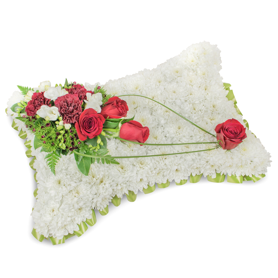 Convey your deepest sympathies with our beautiful floral arrangement, meticulously designed to offer comfort and solace. This exquisite bouquet combines white chrysanthemums, red roses, white freesias, and dark red carnations, elegantly complemented by dianthus and bear grass.